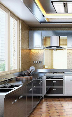 生產不銹鋼整體櫥柜時,要考慮電器、環境等因素。一起使用的抽油煙機、微波爐、烤箱,無論顏色、大小、風格,都與櫥柜相搭配、相匹配。